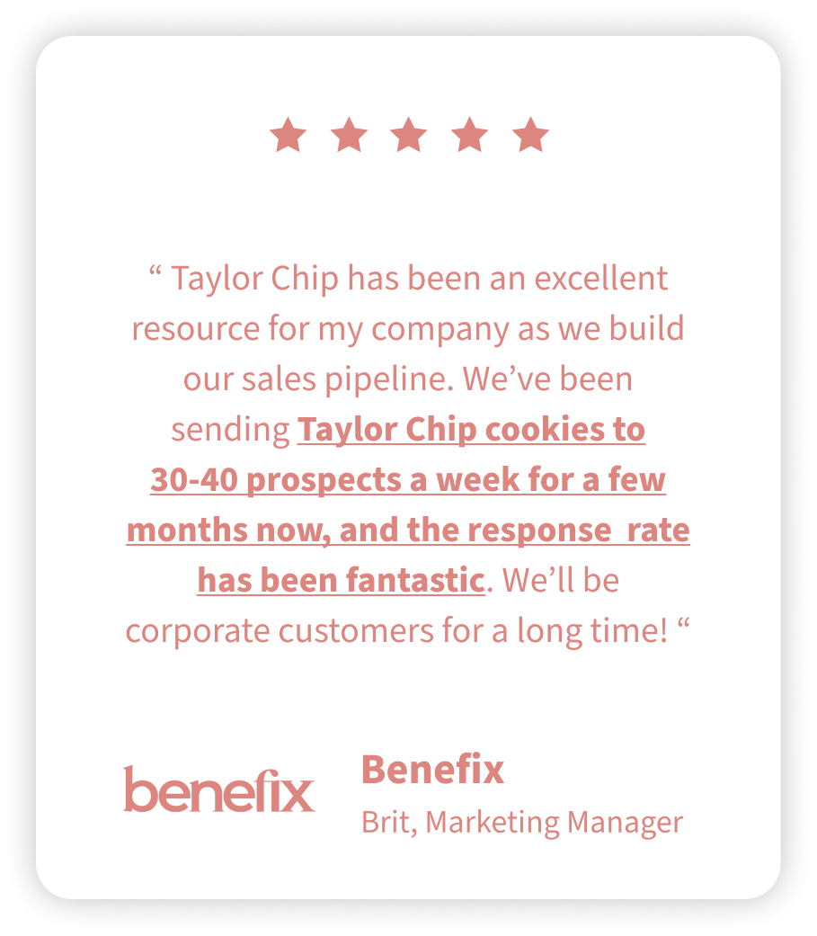 At Taylor Chip, we elevate cookie gifting to an art form. We specialize in premium cookie experiences tailored to fit your brand’s identity and values. Corporate Cookie Gifts are more than just treats—they represent your company's commitment to quality, thoughtfulness, and lasting relationships.Testimonials From Our Happy Corporate Clients